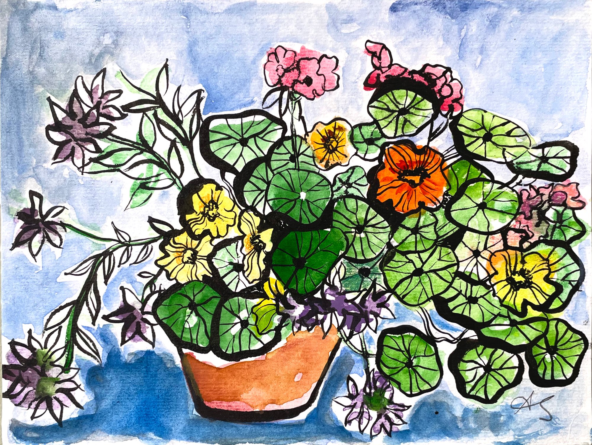 Watercolour and ink on textured watercolour paper 20 x 14.7 cm. Packed in an eco cellophane bag, tissue paper and and a stiff board-backed envelope.