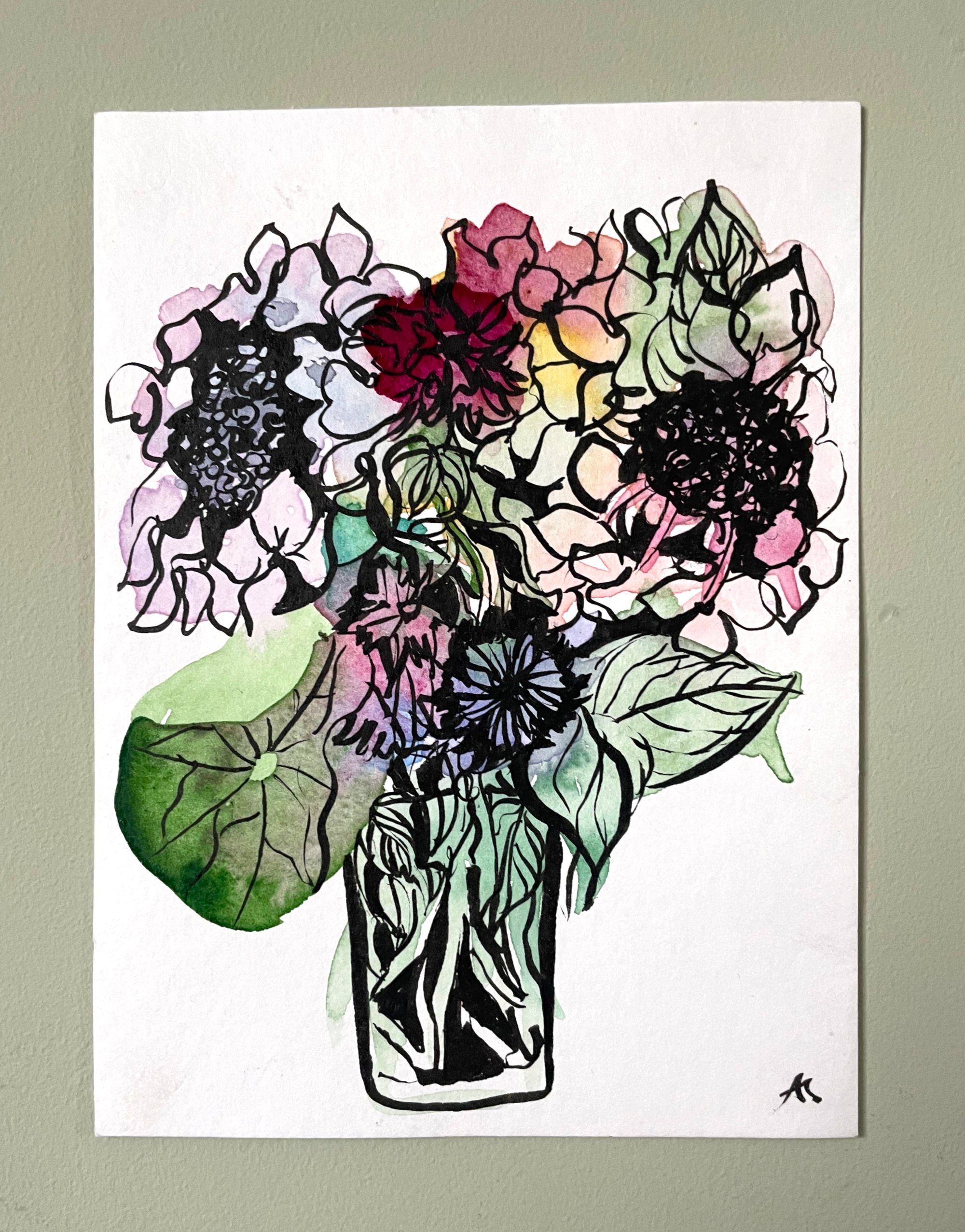 Watercolour and ink on textured watercolour postcard. It is A6 in size (10.5 x 15 cm) Packed in an eco cellophane bag, tissue paper and and a stiff board-backed envelope.